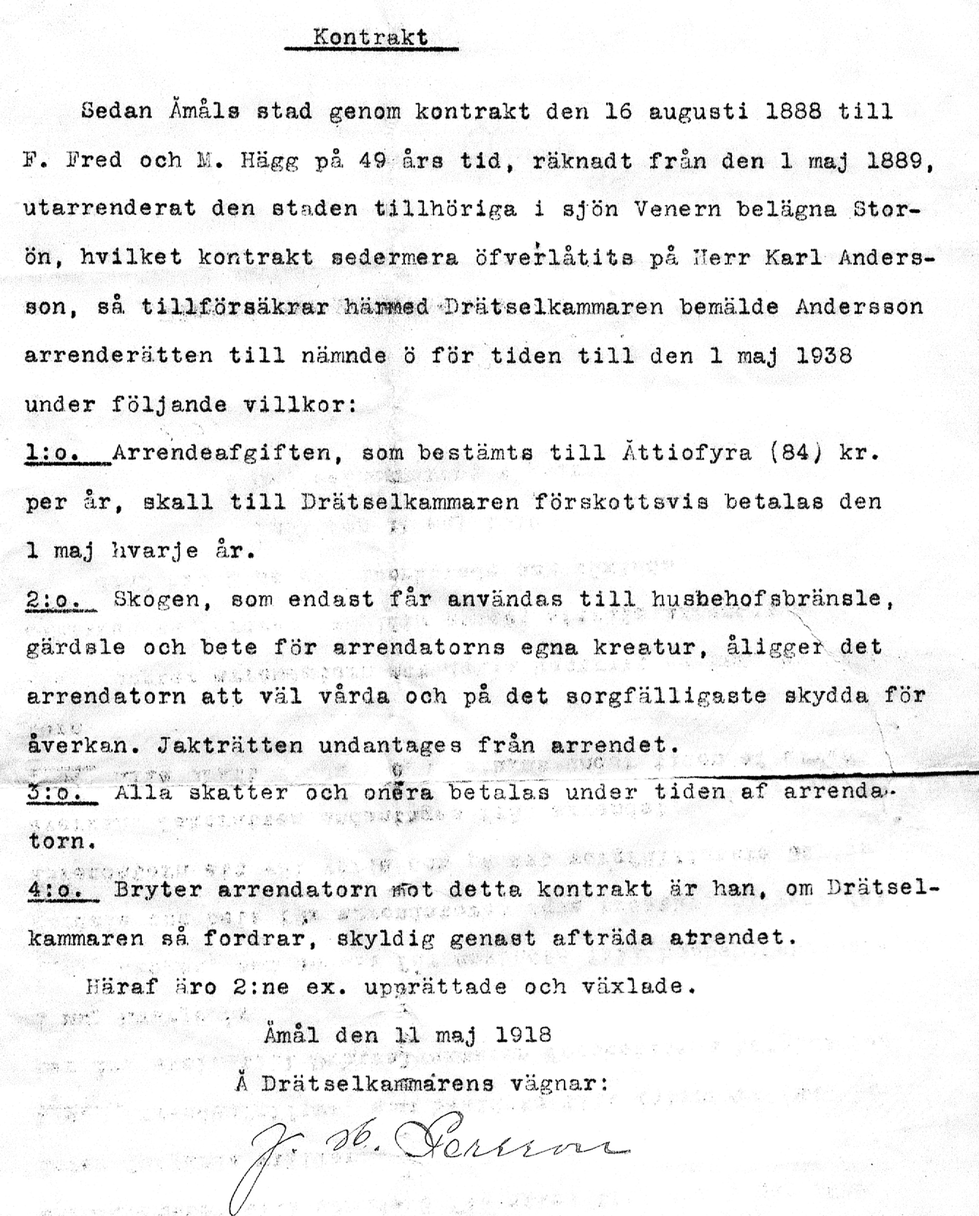 Bilaga till ovanstående: Arrendekontrakt från 1918